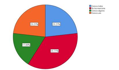 De los alumnos que afirmaron conocer los valores que fomenta el Programa Académico de la licenciatura en nutrición en la figura 4 se nuestra que el 19.64% mencionó todos, el 12.50%, el 17.86% conoce algunos y el 17.86% conoce uno.