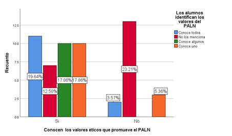Figura 4. Relación de alumnos que identifican los valores que fomenta el Programa Académico de la Licenciatura en Nutrición (PALN) y los que firmaron si conocerlos.