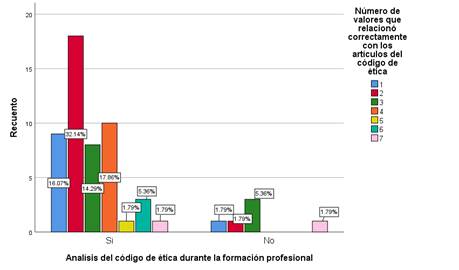 Figura 5. Análisis del código de ética profesional y el número de artículos que relacionaron correctamente con los valores que propone el código de ética.