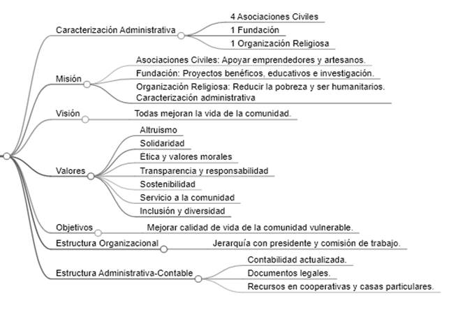 Respecto a la categoría sobre las características administrativas de las entidades sin fines de lucro; se concluye que cuatro de estas organizaciones son asociaciones civiles, centradas en fomentar el emprendedurismo y empoderar a pequeños emprendedores, artesanos, y en crear una economía colaborativa para el crecimiento colectivo. La fundación tiene un propósito benéfico, educativo e investigativo, contribuyendo al desarrollo social de la comunidad, mientras que la organización religiosa busca combatir la pobreza y proporcionar ayuda humanitaria. Todas estas entidades comparten una visión común de mejorar la calidad de vida de la comunidad, respaldada por valores arraigados en el altruismo, la solidaridad, la ética y la transparencia. Además, la sostenibilidad y el servicio a la comunidad son fundamentales en sus operaciones, promoviendo la inclusión y la diversidad en su enfoque. En términos de estructura organizativa, todas siguen una estructura jerárquica con líderes elegidos democráticamente, aunque una entidad cuenta con una secretaría. En cuanto a la gestión administrativa y contable, todos mantienen registros actualizados y cumplen con las regulaciones legales, pero algunos enfrentan desafíos en cuanto a la infraestructura para resguardar los recursos.