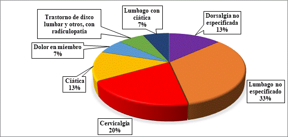 Las causas que generan ausentismo laboral de origen medico por enfermedad laboral, es el lumbago no especificado 33%, cervicalgias 20%, ciática y dorsalgia no especificada 13%, dolor en miembro, trastorno de disco lumbar y otros, con radiculopatía y el lumbago con ciática 7%. al tener presente los resultados de estudios similares a nivel nacional, el 76% de los casos de ausentismo laboral son producto de una enfermedad de tipo musculo-esquelético, si asociamos los resultados de esta investigación en 2009, se realizó un estudio sobre la relación entre el ausentismo laboral por trastornos médicos y la cultura organizacional en un establecimiento médico especializado en asistencia diagnóstica de la región occidental. Podemos ver una disminución considerable en el porcentaje de lesiones de tipo musculo-esquelético, un promedio de 40% de puntos porcentuales.