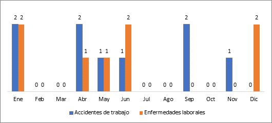 La gráfica anterior muestra que la frecuencia en que se presentan los accidentes de trabajo, es cada dos meses, sobre todo en temporada alta donde aumenta el flujo de pasajeros por considerarse épocas de vacaciones como, semana santa, días festivos; mientras la enfermedad laboral se refleja en los meses de enero, abril, mayo, junio y diciembre, es decir cada dos meses del año.