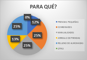 Mientras que, el 33% de los talleres de confecciones de la ciudad de Babahoyo reutiliza los desechos textiles que generan en cada corte y son empleados como: relleno para almohadas, la confección de detalles en prendas combinadas, como arreglos para prendas usadas y la confección de prendas pequeñas nuevas, promoviendo así el diseño sostenible.