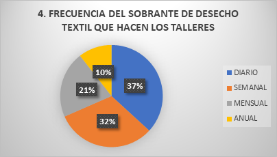 Los resultados de la figura 6 muestran que en los talleres de confecciones de la ciudad de Babahoyo el 37% desechan el sobrante textil con una frecuencia diaria; el 32% de los talleres desechan el sobrante textil semanalmente, esta misma frecuencia fue reportada por (Henao Ortiz , 2015); el 21% de los talleres desechan el sobrante textil cada mes, mientras que el 10% de los talleres desechan los sobrantes una vez por año.