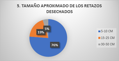 Los resultados de la encuesta mostraron que, de los talleres de confecciones de la ciudad de Babahoyo, el 76% sabe que el tamaño de los retazos que desechan está entre los 5 a 10 cm2, el 19% de los talleres exponen que el tamaño de los retazos que desechan está entre los 15 a 25 cm2; mientras que el 5% de los talleres saben que el tamaño de los retazos que desechan es de 30 a 50 cm aproximadamente.