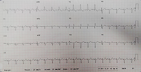 Informe: Taquicardia sinusal, frecuencia 120 X`, eje eléctrico normal, intervalo R-R regular, onda P 0.08 seg normal, intervalo PR 0.16 seg normal, complejo QRS 0.08 seg normal.