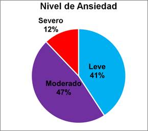 El nivel de ansiedad encontrado en mujeres embarazadas adscritas a la Unidad de Medicina Familiar No. 73 fue severo en 12 %, moderado 47% y leve en el 41 % de la muestra según el puntaje obtenido en la aplicación del instrumento de recolección.