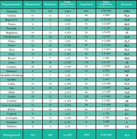“Antioquia es el departamento donde existe el mayor número de personas que donaron a campañas políticas y luego se beneficiaron con la adjudicación de contratos: 103 personas naturales o jurídicas realizaron 1412 donaciones (663 millones de pesos) y recibieron 616 contratos (85,9 mil millones de pesos). Adicional a esto, es el departamento que mayor porcentaje de retorno tiene, los contratistas recibieron en contratos 129 veces lo donado” (Misión de Observación Electoral, 2018, p. 37).