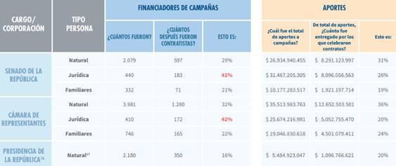 “La amplia presencia de personas naturales y jurídicas que financian campañas y que posteriormente celebran contratos con el Estado evidencia que, entre la diversidad de motivaciones para financiar campañas, es posible que también se encuentren la expectativa de recibir contratos como contraprestación por los aportes. Esta situación se confirma, por lo menos, para la tercera parte de los aportantes privados que financiaron las campañas territoriales de 2015 y las nacionales de 2018” (p. 23).