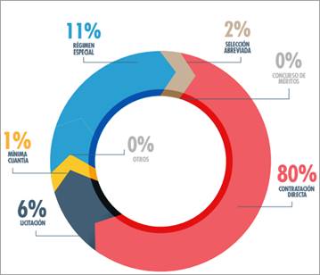 La Misión de Observación Electoral (2018) advierte que las modalidades más recurrentes para la asignación de estos contratos son la contratación directa y las contrataciones que se hacen por régimen especial, como sucede a través de las Universidades Públicas que no se encuentran sujetas a las reglas y procedimientos establecidos en la Ley 80 de 1993. Por ello, luego de las elecciones territoriales del año 2015 se celebraron un total de 1075 contratos y un total de 643 contratos por régimen especial con personas naturales y jurídicas que financiaron campañas políticas y/o que consiguieron los votos necesarios para ello (Misión de Observación Electoral, 2018).