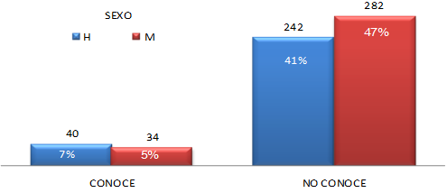 Solo el 40 hombres dijeron saber o tener algun dato sobre su derecho humano, lo cual equivale al 7% de las encuentas realizadas, por su parte, 34 mujeres dijeron conocer sobre su derecho humano, lo cual equivale al 5% del total de la encuesta realizada.