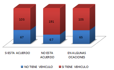 De las 599 personas de las 600 encuestadas, 105 personas con vehículo y 67 personas que no cuentan con vehículo respondieron que si están de acuerdo, por otra parte 191 personas con vehículo y 67 sin vehículo respondieron que no están de acuerdo con que en Chetumal haya cultura vial, por otro lado también se incluyó a aquellas personas que piensan que en algunas ocasiones se da la cultura vial, poniendo como ejemplo 105 personas con vehículo dijeron que en ocasiones, cuando otro conductor les concede el paso, y 67 personas sin vehículo mencionaron que cuando se respetan los pasos peatonales.