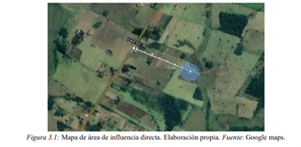 El área pintada en color celeste, del mapa de la figura 3.1, es el área en que puede manifestarse la influencia de forma directa sobre los medios naturales y antrópicos, debido a la instalación y operación del proyecto.