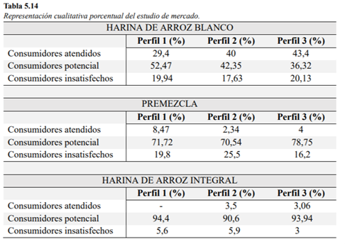 La materia prima es abundante en la zona sur del país, siendo los departamentos de Misiones e Itapúa los dos más grandes productores de Arroz del país y el departamento de Ñe’embucu el cuarto mayor productor de arroz del país. Los tres departamentos citados también son los de mayor rendimiento por hectárea a nivel país. La ubicación proyectada de la planta es en el terreno de uno de los responsables del proyecto, dicha locación consiguió reafirmarse gracias al estudio de centro de gravedad, que se basó en el posicionamiento que tienen 8 productores de arroz blanco con respecto a la ciudad de San Ignacio, siendo 7 de los 8 productores del departamento de misiones y el último restante se encuentra entre el departamento de misiones y Ñeembucú. El estudio de mercado realizado para este trabajo de grado permitió conocer las ciudades con mayor hábito de consumo a nivel país, éstas son Asunción, Encarnación y San Ignacio, teniendo en cuenta el alcance y las limitaciones de la difusión de la herramienta de recolección de datos. El resultado del estudio mercado por producto arrojó las siguientes tendencias: Harina de Arroz Blanco: La harina de arroz blanco tiene consumidores potenciales en un porcentaje que ronda aproximadamente el 43% en promedio, y el 37,6% en promedio aproximadamente han sido consumidores atendidos. Premezcla: La premezcla tiene consumidores potenciales en un porcentaje que ronda aproximadamente el 73,6% en promedio, y sólo el 4,9 % de consumidores ha sido atendido. Harina de Arroz Integral: La harina de arroz integral tiene consumidores potenciales en un porcentaje que ronda el 93% en promedio, y sólo el 2,1% en promedio de consumidores ha sido atendido. Analizando las características de los consumidores de cada producto se puede observar que existe un mercado potencial bastante grande por conquistar, lo que significa que el proyecto tiene un crecimiento importante de consumidores a futuro.