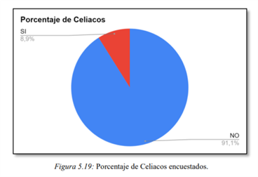 La herramienta de recolección de datos fue elaborada de tal forma que sólo las personas con hábitos de consumo y conocimiento sobre los productos aptos para los celiacos lleguen a la pregunta final: “¿Es usted celiaco?”. Las respuestas afirmativas han sido analizadas una por una con un criterio de verosimilitud. De la muestra de 361 encuestados que llegaron a la última pregunta, el 8,9 % respondió que sí son celiacos, mientras que el 91,1% no lo son, como se observa en la figura 5.10.