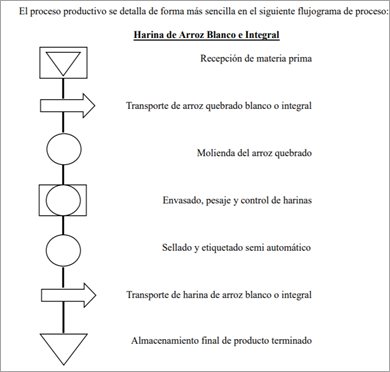 La propuesta presentada consiste en implementar una “Planta manufacturera productora de Harina de Arroz y sus derivados” en la ciudad de San Ignacio Guazú que competirá por el mercado insatisfecho y potencial a nivel país. Según el estudio de mercado realizado, la demanda potencial es bastante importante debido al desconocimiento de la existencia de los productos derivados de la harina de arroz y sus beneficios. Las intenciones de los mismos por consumirlos son notables. El mercado de oferentes de la harina de arroz es un mercado oligopólico dominado sólo por dos empresas productoras a nivel país, que imponen precios elevados como dominantes que son. El mercado de oferentes nacionales de productos como ser; harina de arroz integral y premezcla es inexistente. La materia prima abunda en los departamentos de Misiones, Itapúa y Ñeembucú, esto se traduce en bajos costos logísticos de adquisición de materia prima. El costo de puesta en marcha de la planta manufacturera de harina de arroz y derivados es relativamente menor con respecto a los costos de otras industrias alimenticias.