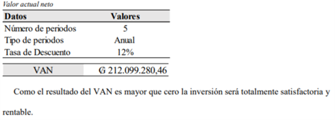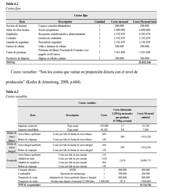 Los recursos necesarios para la fase de preparación, ejecución y de funcionamiento serían cubiertos con un préstamo dirigido a microempresarios que ofrece el Banco Nacional de Fomento con las siguientes características: El préstamo será por el monto de 335.000.000 Gs. (trescientos treinta y cinco millones de guaraníes), siendo éste el costo total de la puesta en marcha de la planta, el mismo se pagará en un plazo de 60 meses con una tasa de interés anual del 12% y de interés mensual del 1%, las cuotas mensuales tendrán el valor de 7.451.890 Gs. (siente millones cuatrocientos cincuenta y un mil ochocientos noventa guaraníes) y, por último, el costo total del préstamo sería 112.113.400 Gs. (ciento doce millones ciento trece mil cuatrocientos de guaraníes).