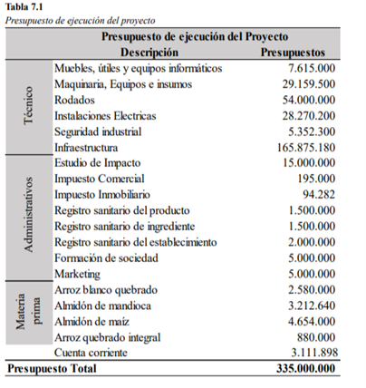 La puesta en marcha del presente proyecto estaría a cargo de los responsables del proyecto Pamela Luján Kallus González y Marco Andres Alvarenga, los mismos se encargarían del financiamiento total que requiere la instalación de la Planta manufacturera de Harina de Arroz. Algunos de los gastos y/o inversiones más próximas son los siguientes: