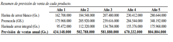 La previsión de ventas se manifestará de acuerdo a la evolución de la conquista de cuota de mercado y la retención de clientes que se representa en los volúmenes a ser vendidos anualmente en la proyección pesimista. Las previsiones de venta anuales de cada producto se calcularon de la siguiente manera; la venta mensual se estimó hallando el producto entre los kilogramos a ser fabricados mensualmente y el precio de venta; y la venta anual es el resultado del producto entre la venta mensual por doce meses.