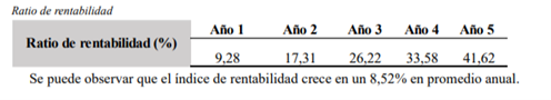 Para calcular la TIR, se han utilizado los datos de los flujos de caja de los cinco periodos y también la inversión inicial. Para hallar el resultado se utilizó la fórmula predeterminada (TIR) de la hoja de cálculo Excel. Ratio de rentabilidad. Indica la relación que existe entre el rendimiento obtenido en un determinado período y los activos totales de la empresa. Su finalidad es poder determinar la capacidad que tienen los activos para generar beneficios. Se calculó dividendo el flujo neto por el flujo bruto de cada año, multiplicado por 100, obteniéndose así los siguientes resultados como se detallan en la tabla 7.9