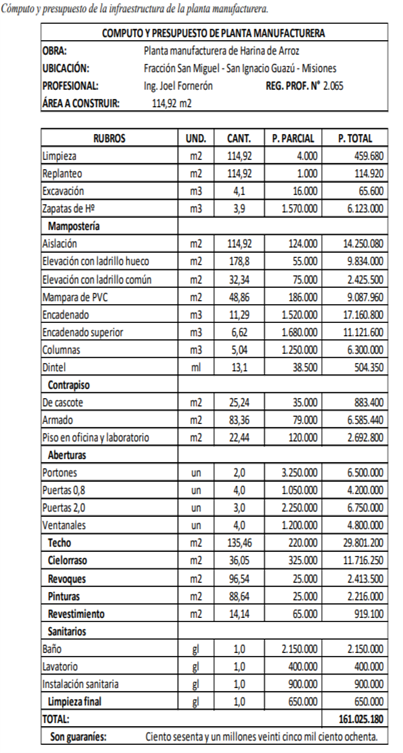 Palabras clave: viabilidad; planta manufacturera; harina de arroz; TACC; celiacos