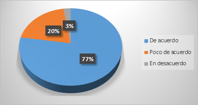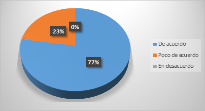 A la encuesta aplicada sobre la feria de la ciencia a la muestra de estudiantes, en la pregunta “Mejoraste la oralidad al exponer tus proyectos”, 40 estudiantes respondieron bajo la siguiente distribución porcentual: 77% de acuerdo, 23% poco de acuerdo y 0% en desacuerdo.