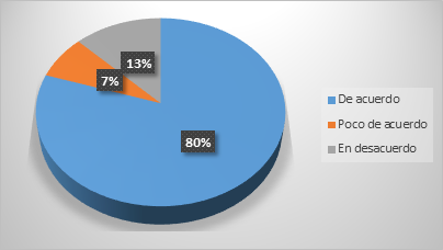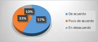 A la encuesta aplicada sobre la feria de la ciencia a la muestra de estudiantes, en la pregunta “Adquiriste habilidades como la búsqueda de literatura”, 40 estudiantes respondieron bajo la siguiente distribución porcentual: 57% de acuerdo, 33% poco de acuerdo y 10% en desacuerdo.