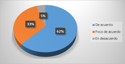 A la encuesta aplicada sobre la feria de la ciencia a la muestra de estudiantes, en la pregunta “Desarrollaste habilidades creativas como originalidad e innovación”, 40 estudiantes respondieron bajo la siguiente distribución porcentual: 62% de acuerdo, 33% poco de acuerdo y 5% en desacuerdo.