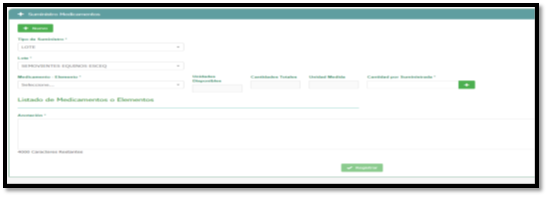 “suministro medicamentos” discrimina los mismos ítems de alimentos, la diferencia radica en que luego permite elegir medicamentos de acuerdo con lotes o individuos, de ahí se solicita complementar información como la cantidad suministrada, unidad de medida y anotación del tratamiento instaurado.