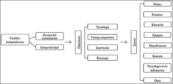 Tabla 1: Sectores económicos y dimensiones que relacionan los autores con respecto a la incursión de la gestión del conocimiento y la competitividad