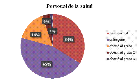 La encuesta Ensanut 2018 reporta que el 39.1 % de la población mayor de 20 años tiene sobrepeso, en el estudio realizado por Andón Mendiola20 reporto el 51 % mientras que en nuestro caso encontramos un 45 % siendo mayor al reportado en ENSANUT esta diferencia es debida a un bajo consumo de frutas, verduras e inactividad física por parte del personal de la salud estudiado.