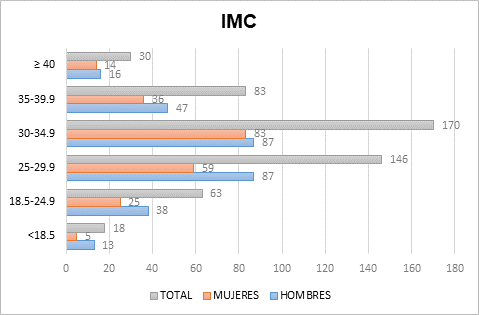 Gráfica 1. Durante la recolección de datos obtuvimos 18 pacientes que contaban con un índice de masa corporal inferior al 18.5, 13 eran masculinos y 5 femeninos; mientras que en el rango de 18.5 a 24.9 un total de 63 pacientes entre ellos 38 masculinos y 25 femeninos, en el siguiente rango de 25 a 29.9 con un total de 146 paciente, 59 son masculinos y 87 femeninos; mientras que en el rango de 30 a 34.9 obtuvimos 170 pacientes que destacan 87 masculinos y 83 femeninos; en el penúltimo rango de 35 a 39.9, 83 pacientes, 47 son masculinos y 36 femeninos; por último igual o mayor a 40 un total de 30, 16 masculinos y 14 femeninos.