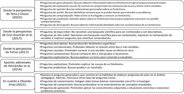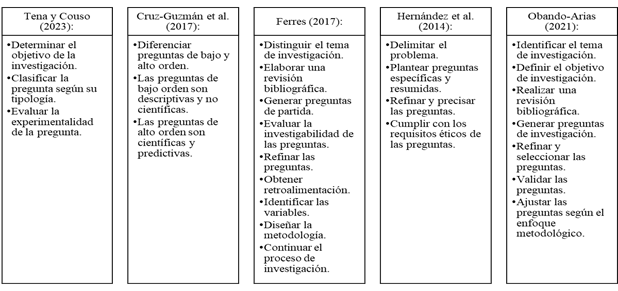 Hernández et al. (2014) proponen estrategias que incluyen no conocer las respuestas de antemano, basarse en evidencia empírica, utilizar medios éticos y formular preguntas claras y sustanciales. Obando-Arias (2021) presenta criterios como claridad, relevancia, factibilidad, originalidad, apertura y coherencia, además de una guía de trabajo para plantear preguntas generadoras, a continuación, se presenta un resumen de los aspectos que destacan para términos de la presente investigación: