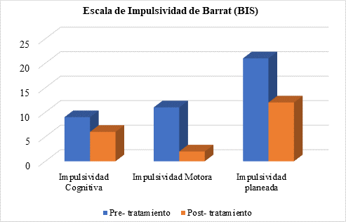En los resultados post-tratamiento, se pudo evidenciar una reducción de los rasgos de ansiedad, así como la disminución de la impulsividad cognitiva, motora y planeada, corroborando que las técnicas cognitivo-conductual y técnicas gestálticas, acompañadas de la entrevista motivacional que contribuyen en la eficacia del tratamiento, coincidiendo con lo indicado por Robledo-Marín et al. (2021)