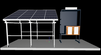 La estructura metálica que soporta los paneles solares cuenta con unas dimensiones 3.25 m de largo, 1.5 m de ancho y 1.6 m de alto, mientras que los paneles fotovoltaicos tienen una dimensión de 1.5 m de largo por 0.8 de ancho. A los estudiantes les llevo 2 meses el desarrollo en físico de las dos partes del módulo de enseñanza de SFA.