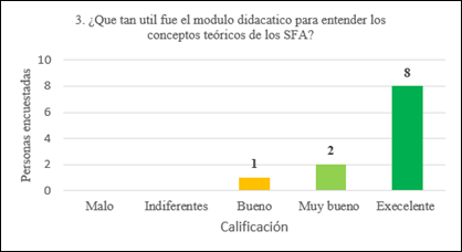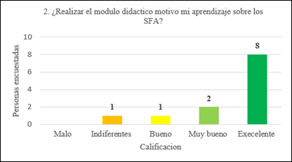 De los resultados obtenidos en el cuestionario se puede ver claramente en las figuras 11, 12, 13 y 14 que el módulo didáctico para el aprendizaje de los SFA fue adecuado para que los estudiantes adquirieran conocimientos teóricos y prácticos sobre los SFA