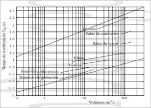 En la : El tiempo ideal de , se muestran unos rangos aproximados de valores del tiempo de reverberación optimo, en función del volumen del local y de su uso previsto. (Domingo, 2022)