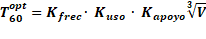 […] donde Kfrec es un coeficiente que depende de la frecuencia (p.ej., es de 1,3 para 125 Hz y de 0,9 para 4 kHz), Kuso es un coeficiente que depende del uso del local (p.ej., es de 0,075 para palabra y de 0,10 para música), Kapoyo es un coeficiente que depende del apoyo electro acústico (p.ej., es de 1 sin apoyo y de 0,085 con apoyo, aunque depende de la intensidad del apoyo) y V es el volumen del recinto en m3. Esta expresión correspondería al local vacío y necesita un ajuste cuando se tiene en cuenta la absorción sonora de los ocupantes. Además de ésta, hay toda una serie de expresiones empíricas, en algunos casos únicamente para un tipo de sala. (Domingo, 2022, pág. 34)