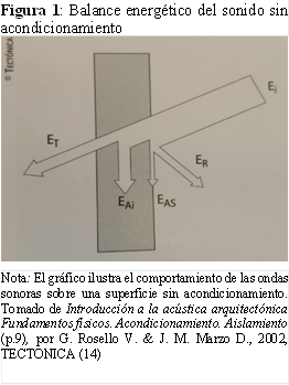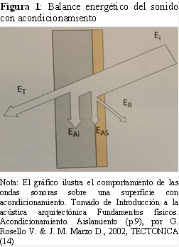 La figura 2 representa el choque de ondas sonoras en una pared sin acondicionamiento, existe una energía incidente (E1), la misma es parcialmente reflejada (ER), “parcialmente absorbida superficialmente (EAS), parcialmente aislada interiormente (EAi)” y por último parcialmente transmitida (ET).” (Roselló Vilarroig & Marzo Diez, 2002, pág. 9)