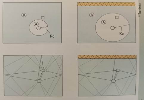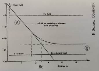 Las autoras continúan indicando que “El nivel sonoro de campo directo (A) disminuye al alejarse de la fuente sonora mientras que en el campo reverberante (B) — zona de predominio del sonido reflejado — es constante.” Existe un radio crítico Rc que “marca el límite entre ambos campos, siendo la inteligibilidad mayor en el directo, por lo que, para mejorarla se debe reducir el campo reverberante aumentando la absorción.” (Roselló Vilarroig & Marzo Diez, 2002, pág. 9)