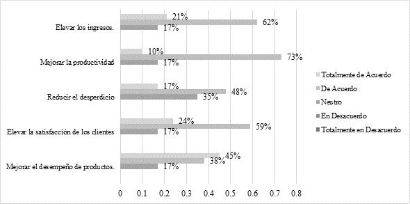 En lo que respeta a las motivaciones para buscar la certificación ISO9001 (figura 1), los resultados muestran que un significativo 45% de los empresarios considera que la mejora del desempeño de los productos es una razón importante para buscar la certificación, indicando una clara conciencia de la relación entre la calidad certificada y la excelencia del producto. Así mismo, la elevación de la satisfacción del cliente también es destacada, con el 59% de los empresarios de acuerdo en que es una motivación importante. Esto sugiere un reconocimiento generalizado de la importancia de la calidad en la satisfacción del cliente. Igualmente, la reducción del desperdicio recibe un respaldo considerable, con el 48% de los empresarios de acuerdo. La neutralidad del 35% indica una división de opiniones sobre la efectividad de la certificación en este aspecto.