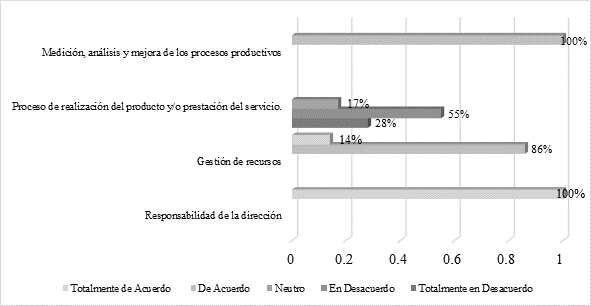 Martínez et al. (2018), por su parte, halló que las principales dificultades se presentan en la gestión documental y en los aspectos relacionados con la responsabilidad de la dirección en establecer políticas, objetivos de calidad y planeación estratégica. Además, se observan limitaciones en la estandarización de operaciones y en la programación, medición, seguimiento y control de procesos.