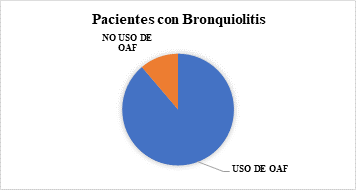 La bronquiolitis es una enfermedad que afecta principalmente a aquellos pacientes entre las edades de 0 a 2 años, con un pico más alto de casos a los 6 meses, relacionado con los cambios de temperatura en ciertos meses del año, en Ecuador se evidencia un pico alto entre los meses de noviembre a marzo, y afecta al mismo grupo etario. El uso del dispositivo de Oxígeno de alto flujo es una de las terapias que ha estado incrementándose en los últimos tiempos, en nuestro medio ha sido uno de los principales medio terapéutico para mejorar los cuadros de bronquiolitis, sobre todo aquellos que han estado en crisis moderadas según las escalas de gravedad, con el fin de poder reducir los efectos adversos y las probabilidades de ingreso a áreas críticas, incluso se han evidenciado casos que su uso varia desde unas horas hasta varios días, lo que no tiene relación es con el número de días de estancia hospitalaria.