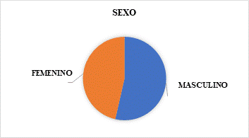 Gráfico 2: Distribución de pacientes según sexo en pacientes con bronquiolitis que usaron dispositivos de OAF. Masculino 53.6% vs Femenino 46.4% (n=95)