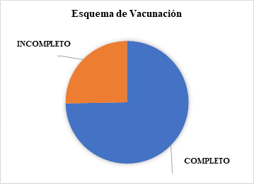 La relación que se encuentra de la enfermedad de bronquiolitis con el cumplimiento del esquema nacional de inmunizaciones no ha tenido gran relevancia en nuestro estudio, pues de todos nuestros pacientes 71 (74.7%) contaban con el esquema al día, la importancia de la vacunación en los estudios de bronquiolitis radica en la posibilidad de sobreinfección y de complicaciones, Szulman, Sapia, Dastugue, Mascardi, & López, en su estudio en el 2023, mencionan a la vacunación como un factor de riesgo asociado en la hospitalización y complicación de los lactantes, refiriendo a los esquema de inmunizaciones incompletas.