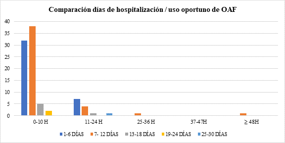 El uso del OAF en un tiempo oportuno, considerando este como el menor tiempo que transcurre entre la llegada del paciente hasta la administración del dispositivo, fue nuestro principal punto de investigación, se encontró que 77 de ellos usaron esta terapéutica en las primeras 10 horas de ingreso (81.05%), con una estancia hospitalaria en su mayoría entre 7 a 12 días (49.3%), comparando con aquellas que se instaura el tratamiento posterior a las 10 horas, 7 (53.9%) tuvieron una estancia menor de 6 días. El uso temprano del OAF, puede determinar una disminución de la probabilidad de ingreso a terapia intensiva o de progresar al uso de ventilación mecánica invasiva, de hecho, en el estudio realizado por González Martinéz, M, & Rodríguez Fernández, en el año 2013, concluyen que el uso del OAF ayuda a disminuir la frecuencia cardiaca, laa frecuencia respiratoria y la escala de gravedad clínica usada para valorar a los pacientes, así como la reducción de los ingresos a UCIP.