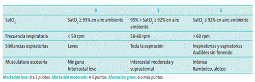 La bronquiolitis se define como aquella patología respiratoria que afecta a las vías respiratorias inferiores con un número mayor de casos en pacientes menores de 1 año y que ocupa un gran porcentaje de ingresos hospitalarios, causando un daño en el epitelio respiratorio de las células y una respuesta inflamatoria que ocasiona necrosis y edema bronquial, con aumento de producción de moco y estrechando la vía aérea. (1) (7) (8) (10). La gravedad de esta dificultad puede ser valorada por escalas que evalúan ciertos parámetros como frecuencia respiratoria, frecuencia cardíaca, ruidos respiratorios y determinación de saturación de oxígeno (1) (10).