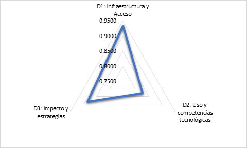 Se representa en la Figura 1 a través de un gráfico radial, la percepción de los empresarios turísticos del uso de las tecnologías de la información en Huaraz, utilizando índices de 0 a 1, donde 0 indica un mayor uso. Las dimensiones de la investigación son infraestructura y acceso, uso y competencias tecnológicas e impacto y estrategias, y los valores correspondientes son 0,9339, 0,8262 y 0,8844, respectivamente.