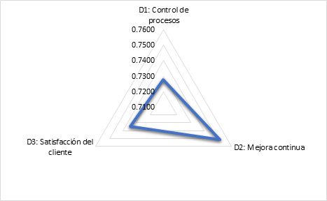 En la Figura 3 a través de un gráfico radial se representa la percepción de la gestión de la calidad por parte de los empresarios turísticos en Huaraz. Las dimensiones de la investigación son control de procesos, mejora continua y satisfacción del cliente, y los valores correspondientes son 0,7278, 0,7519 y 0,7347, respectivamente.