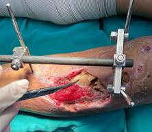 Bajo anestesia subaracnoidea, se realiza la asepsia y antisepsia en miembro inferior izquierdo, se coloca campos operatorios y se inicia desbridamiento de bordes de zona cruenta la cual se amplía con una incisión longitudinal proximal y distal de 3 cm aproximadamente. Se continua con un lavado profuso con antisépticos y solución salina. Se procede a realizar curetaje de extremos óseos y fijación con tutores externos: 2 pines transversales en fragmento proximal y 2 pines en fragmento distal (TUTOR EXTERNO AO).